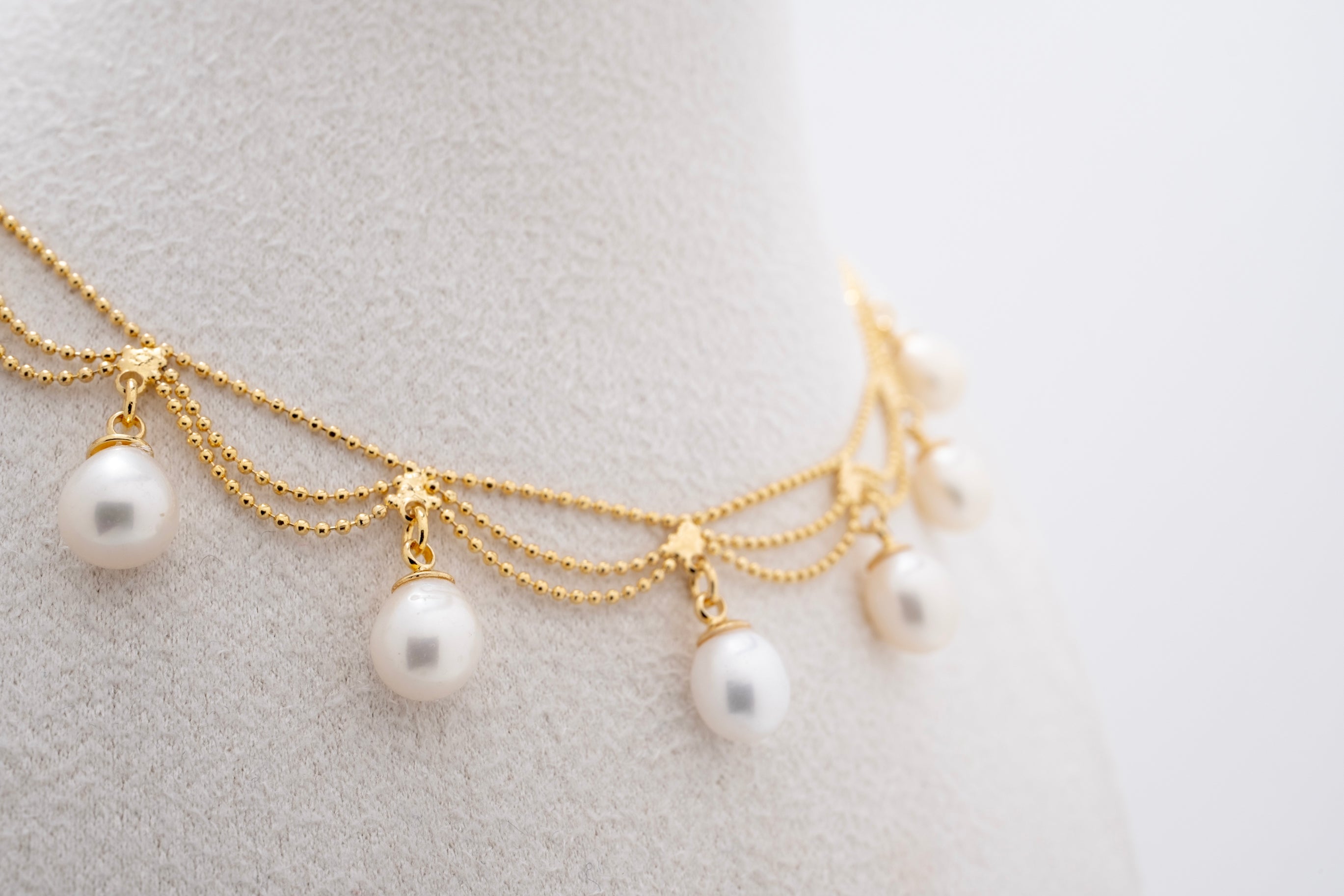 This stunning necklace features delicate gold chains adorned with luminous pearls, creating a perfect blend of elegance and charm